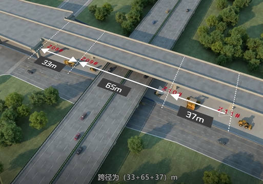 據(jù)悉,高鐵新城快速路連接線是524國道的重要組成部分,也是蘇州市快速路東環(huán)放射線北延伸段,該項(xiàng)目采用全線高架+地面輔路的敷設(shè)形式,路線全長約1.8公里,其中8#-11#為(33+65+37)m三跨等高連續(xù)鋼箱梁,主跨上跨繞城高速,梁高2.5m,橫斷面為單箱三室結(jié)構(gòu),總寬度26m,總重量2051噸。