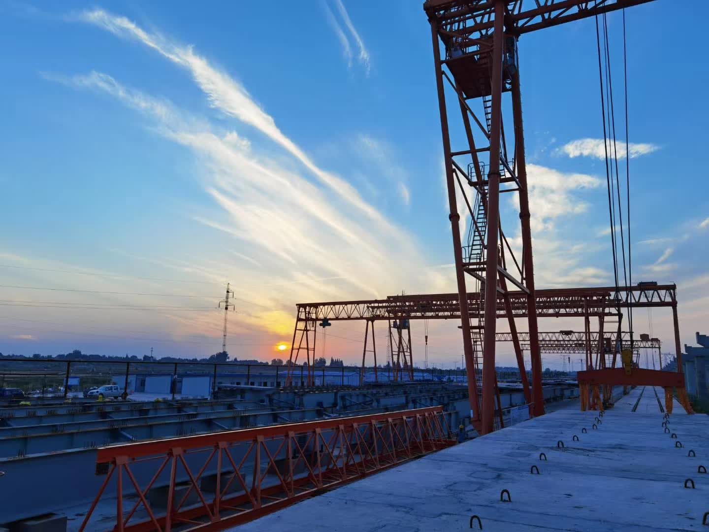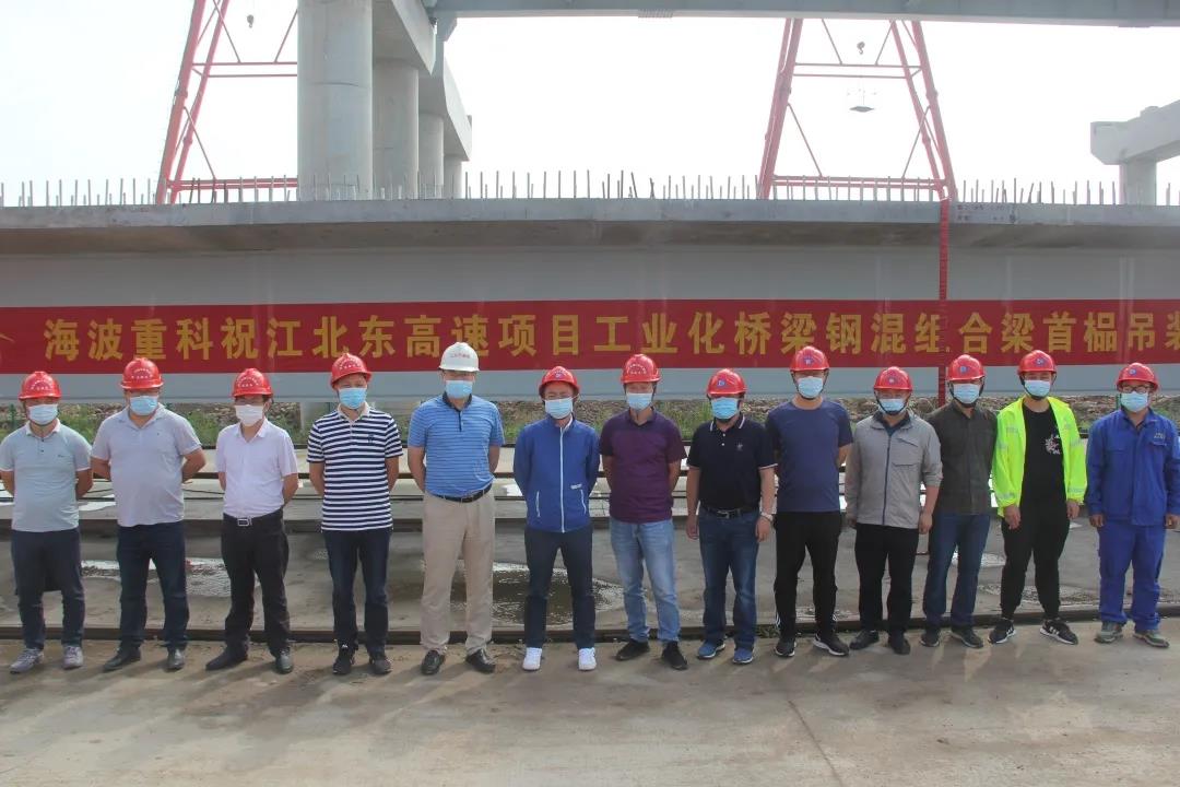 (海波重科新聞報(bào)道)2020年5月26日上午9:00,業(yè)主、項(xiàng)目公司副總經(jīng)理黃遵義、長江路橋江北東高速項(xiàng)目經(jīng)理王懷才、副經(jīng)理白朝峰、總工楊建波、PC預(yù)制場項(xiàng)目負(fù)責(zé)人及項(xiàng)目副經(jīng)理程波、技術(shù)部部長歐陽旭、監(jiān)理單位總監(jiān)辦總監(jiān)文輝、副總監(jiān)張貴士、副總監(jiān)趙廷奎、質(zhì)量部部長鄧再鑫、試驗(yàn)室主任安紅偉、海波重科總經(jīng)理劉乾俊、海波重科項(xiàng)目現(xiàn)場負(fù)責(zé)人閆思為等各位領(lǐng)導(dǎo)、現(xiàn)場作業(yè)人員及媒體記者工作人員共同見證江北東高速項(xiàng)目工業(yè)化橋梁鋼混組合梁首吊的成功。