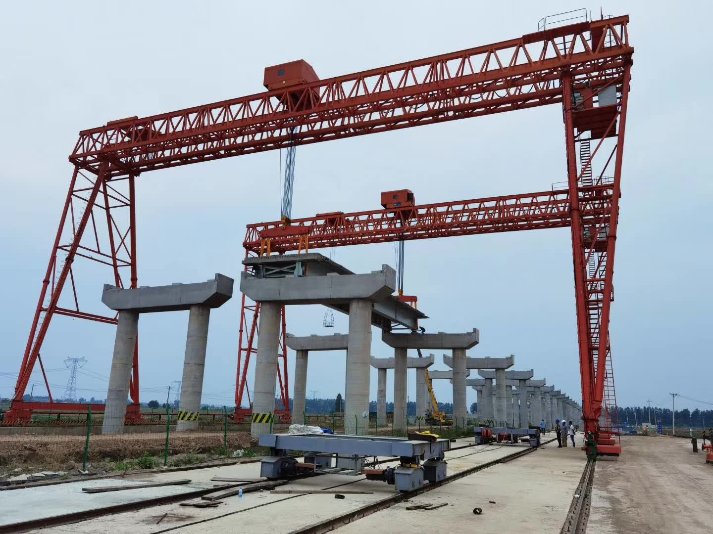 江北東高速公路是湖北省“十三五”綜合交通規(guī)劃重點(diǎn)建設(shè)項(xiàng)目之一,本次吊裝的鋼混組合梁是工業(yè)化橋梁上部結(jié)構(gòu)第一榀梁,位于汊河服務(wù)區(qū)特大橋右幅27孔,單榀梁長30m、寬6.125m、高1.7m,重134.4噸,利用2臺(tái)125噸跨墩龍門吊進(jìn)行吊裝。本次吊裝的鋼混組合梁由2#疊拼梁場疊拼,采用“開口鋼梁+砼橋面板” 的鋼混組合梁,先簡支后橋面連續(xù)。