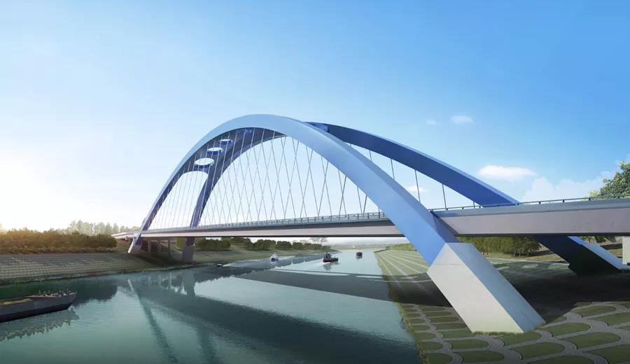 引江濟淮工程合銅黃高速公路橋,橋位位于安徽省合肥市廬江縣。全橋鋼結(jié)構(gòu)重量為7746噸,是安徽省水利“一號工程”,為地標(biāo)性高速公路橋。主橋采用鋼箱提籃拱橋一跨跨越引江濟淮工程水域。橋面采用首輪全匹配,其他輪次采用左右側(cè)主梁匹配制造,橫梁做成標(biāo)準(zhǔn)段發(fā)現(xiàn)場安裝,橫梁中間預(yù)留焊接環(huán)縫并加放補償量用于現(xiàn)場調(diào)節(jié)用;拱肋采用48米超高支架架設(shè)的安裝工藝。對全橋整體制造的線形控制精度要求極高。
