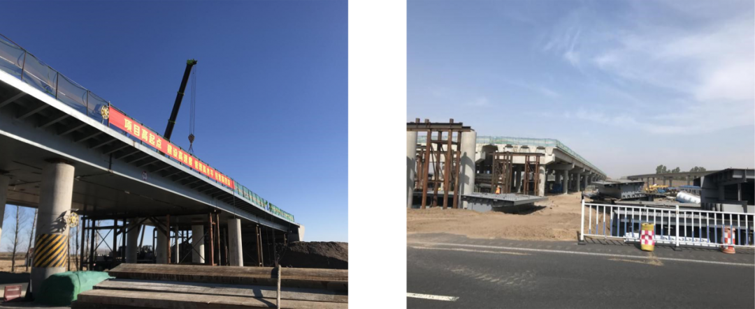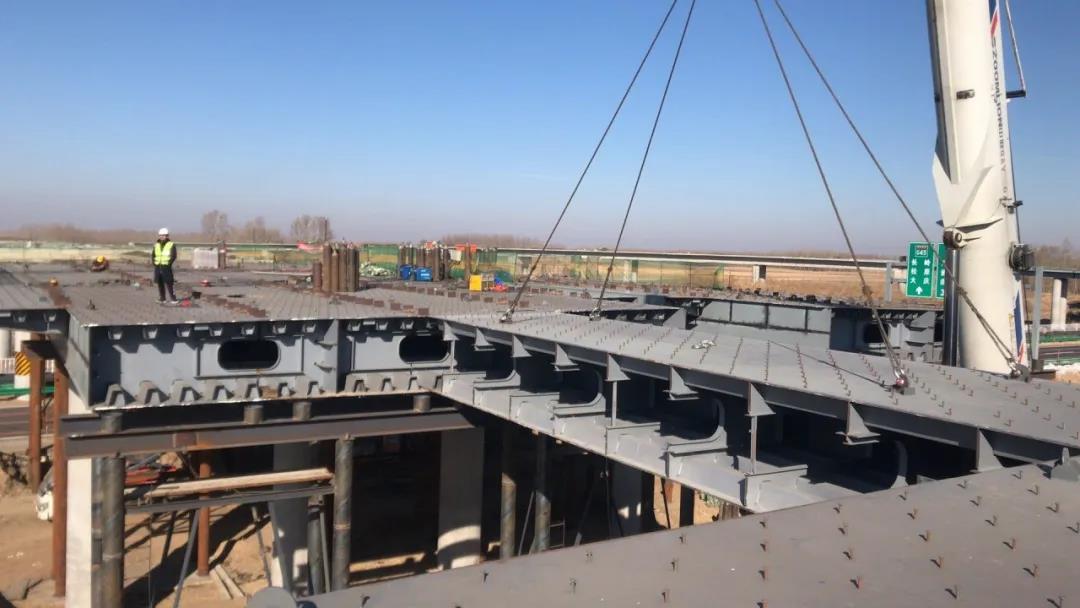 2018年10月,該項目順利完成了鋼箱梁首吊工作,其中敖卜互通均橫跨長深高速,協(xié)力互通XC匝道橫跨大廣高速,施工過程中既需保證高速半幅通車,還需保證過往車輛、施工人員的安全,施工難度極大,同時各聯(lián)段按照既定計劃實施存在較多變數(shù),工期保證難度極大。為保證項目順利完成,在海波重科現(xiàn)場負責人胡劍濤帶領(lǐng)下,克服種種困難,與甲方密切配合,制定合理的、切實可行的聯(lián)段安裝計劃和可行的交通疏導方案,以保證長深高速、大廣高速車流順暢,同時做好安全防護工作;合理安排梁段安裝順序,選擇最優(yōu)的吊車占位地點,提高安全性、減小安裝難度。